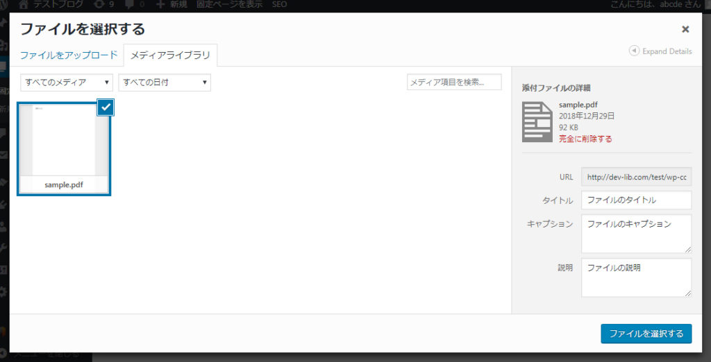 「ファイルを追加する」ボタンを押すと、下の画像のようにメディア投稿ウィンドウが開きます。
