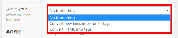 通常のWEB開発時には改行コードをHTMLの改行タグに置換する必要がありますが、このプラグインでは項目を作成するときに選択しているのでそれ通りに出力されます。