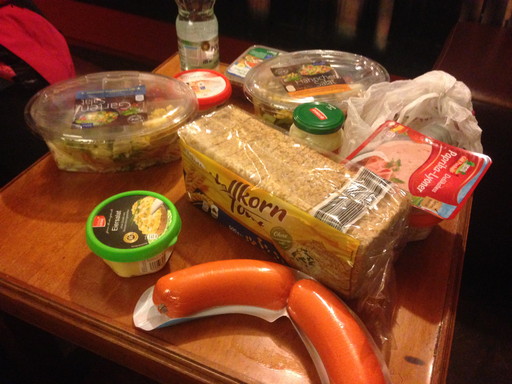 宿にキッチンが無いからパンに挟んで食えるもんを買って1階の共有スペースパーティしました。