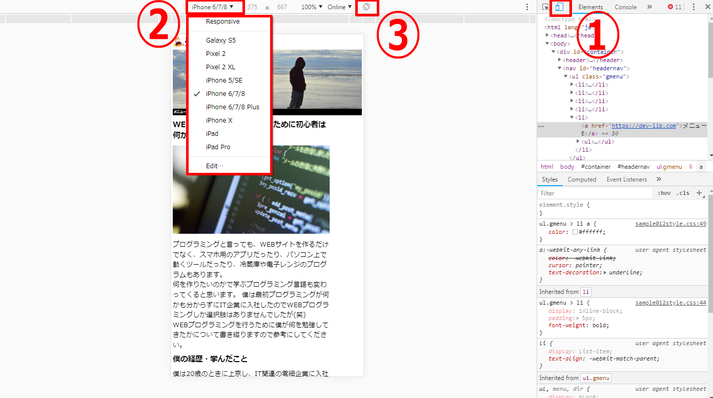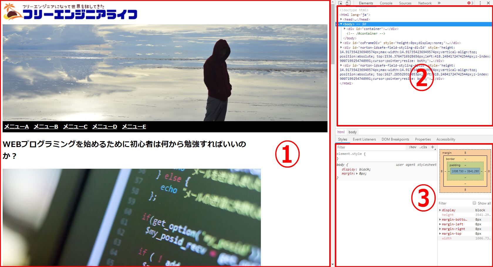 デベロッパーツールを起動すると上の画像の②と③のエリアが出てきます。