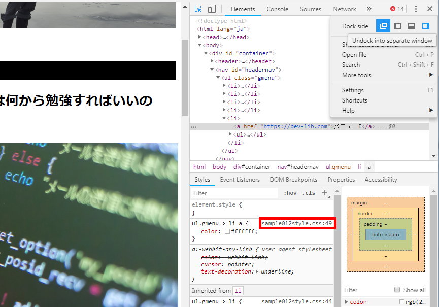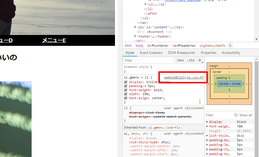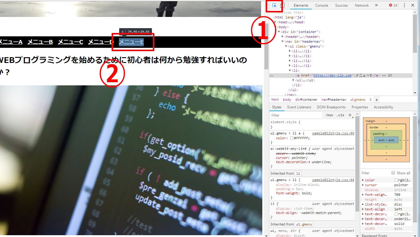 上の画像の①をクリックし、CSSやHTMLを詳しく知りたいポイント(例えば②)にカーソルを持っていきます。