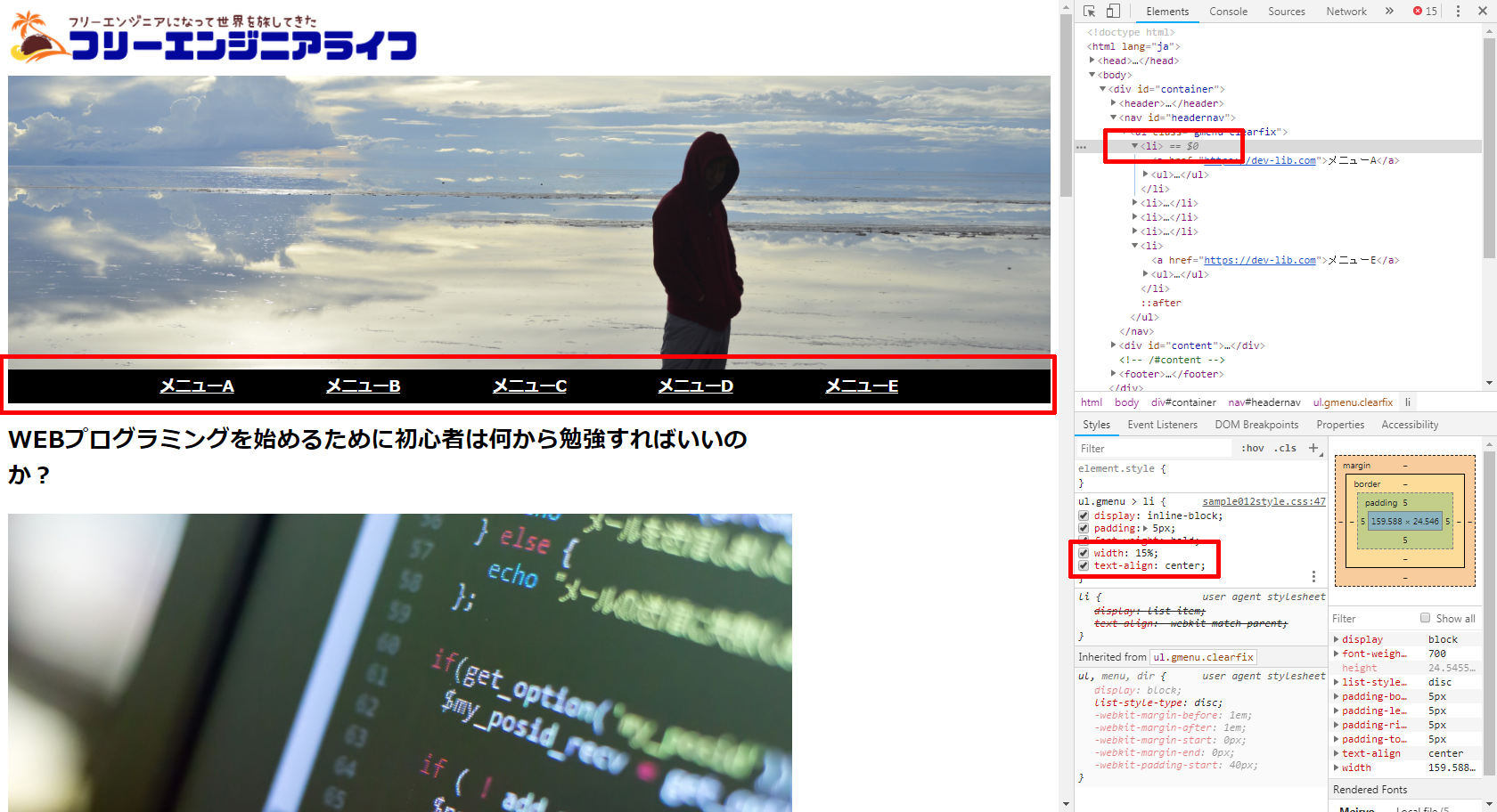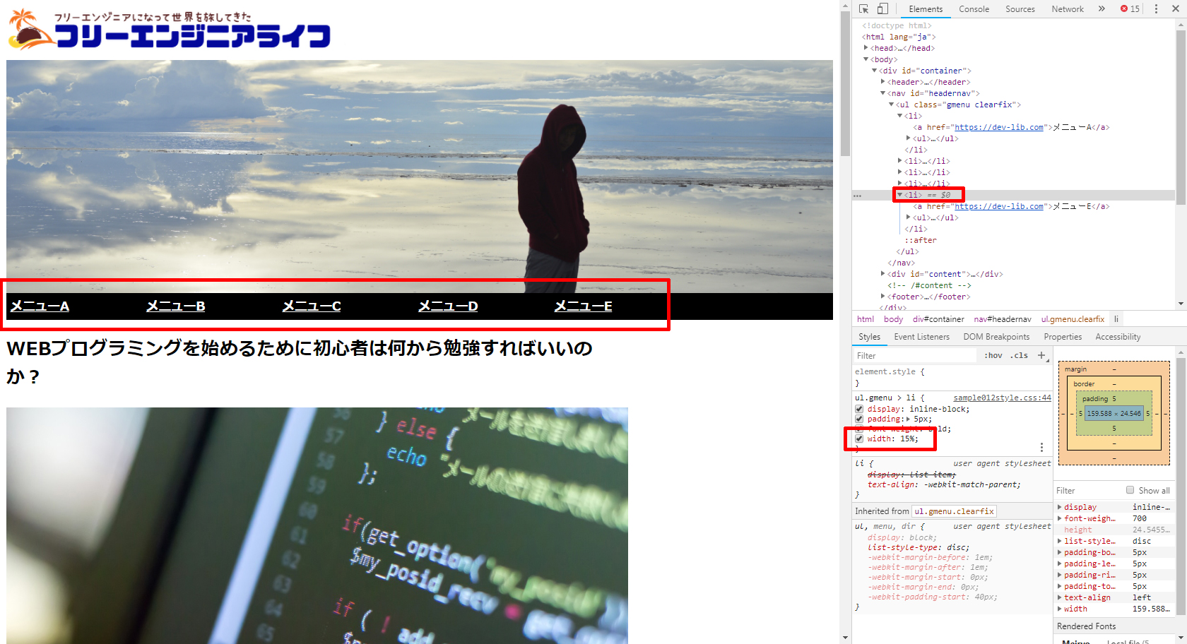 メニュー項目を作っている li タグに対し、width: 15%; を設定してみました。