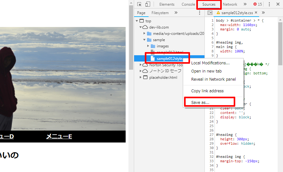 赤枠の部分で「右クリック」→「Open in new tab」をクリックすれば別タブでCSSファイルが開かれてURLからどのファイルか特定することも可能です。