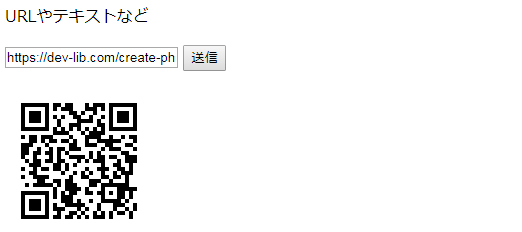 上記のサンプルコード(index.php)もアップロードしたら、QRコード作れます。