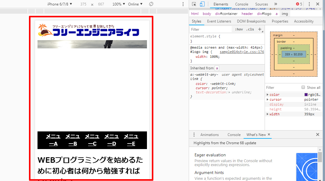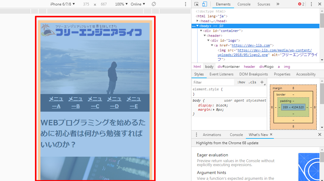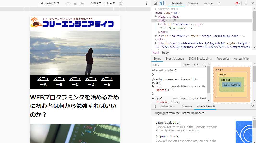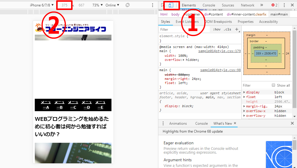 ちなみに画面スマホやタブレットの幅は chrome のデベロッパーツールで確認出来ます。(最終的には実端末でテストしてください。)