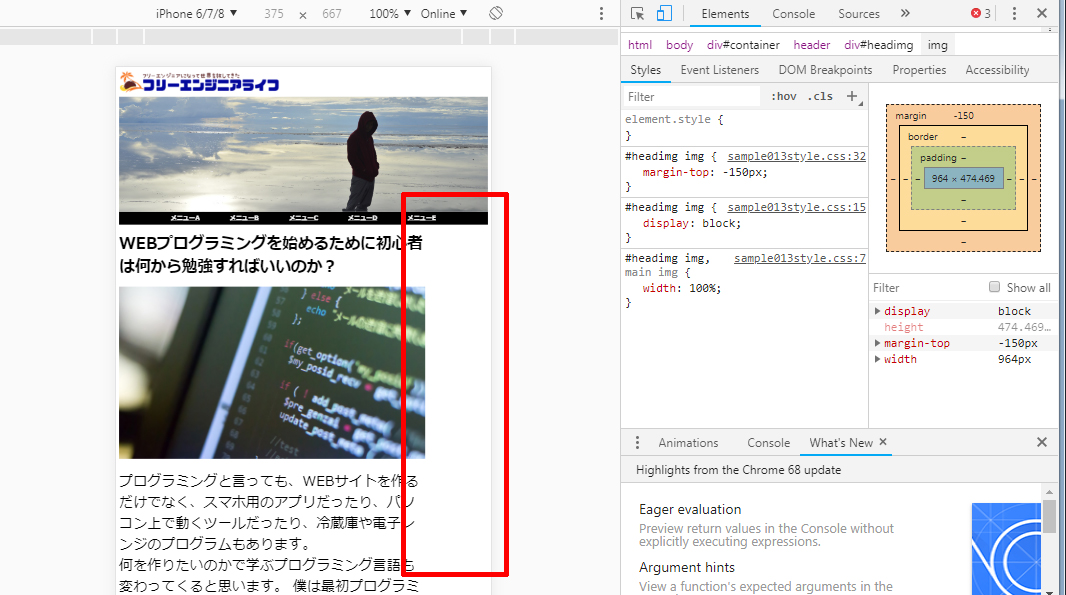 上の例ですと「画面のサイズが414px以下の場合には、main タグの横幅は100%とします。」という設定になります。