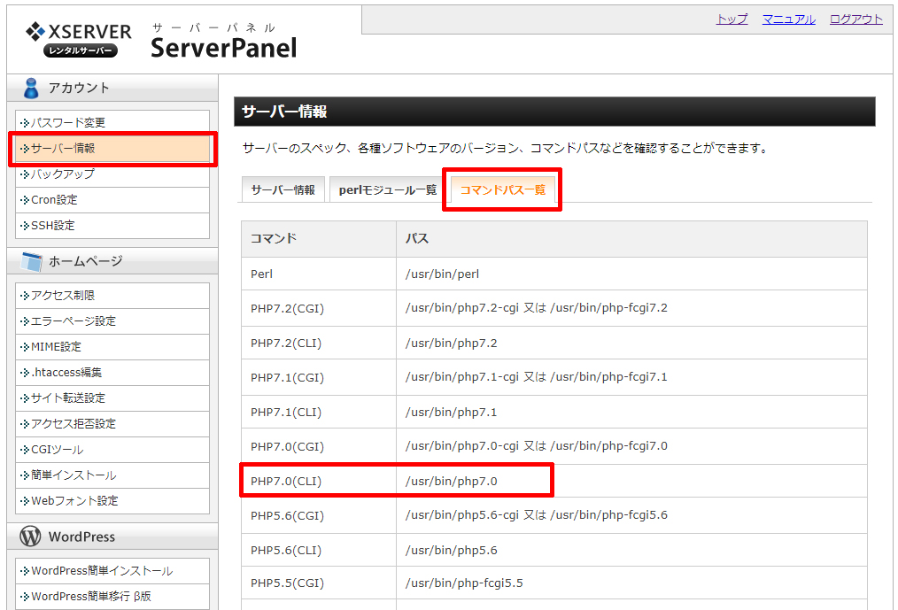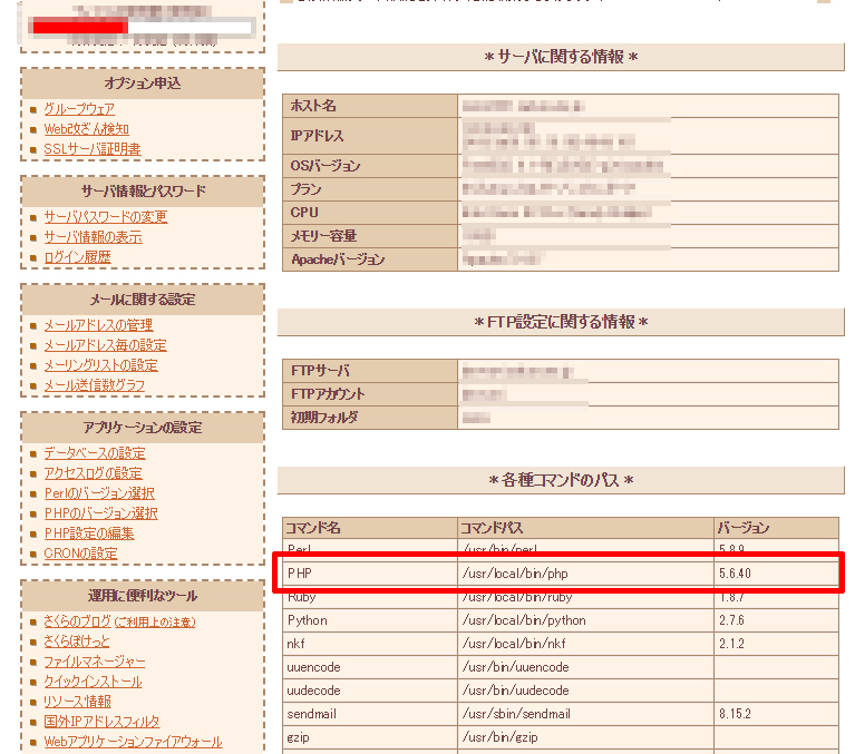 PHPコマンドは、各レンタルサーバーの「サーバー情報」を確認すると記載されています。