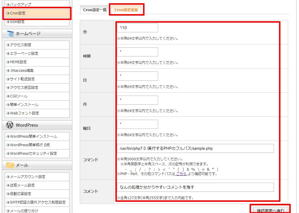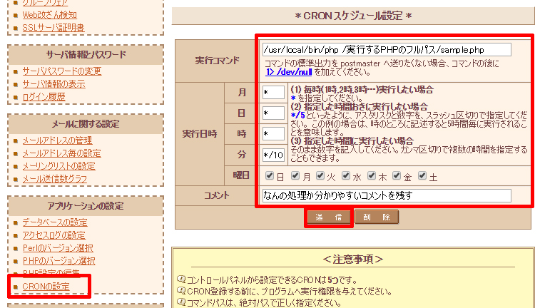PHP7.0を選択したので、コマンドには「/usr/bin/php7.0 /実行するPHPのフルパス/sample.php」のように書いています。