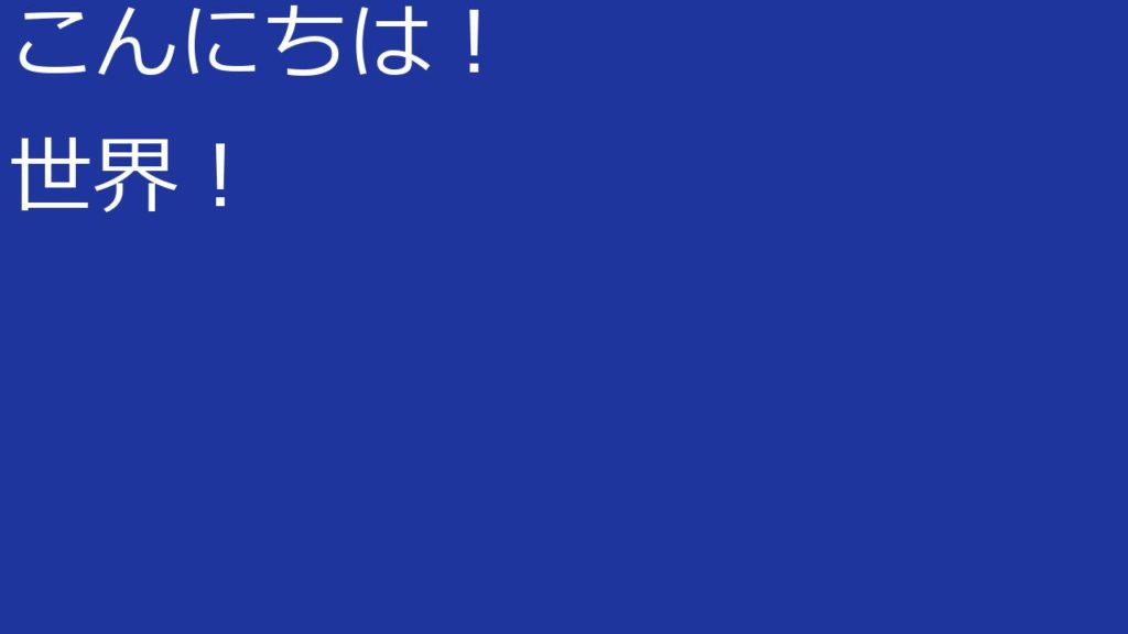 // 文字列を挿入する先の画像 $file = "blue.jpg"; // 出力後のファイル名 $newfile = "bule_moji.jpg"; // コピー先画像作成 $image = imagecreatefromjpeg($file); // 挿入する文字列 $text = "こんにちは!\n世界!"; // 挿入する文字列のフォント(今回はWindowsに入ってたメイリオを使う) $fontfile = "C:\Windows\Fonts\meiryo.ttc"; // 挿入する文字列の色(白) $color = imagecolorallocate($image, 255, 255, 255); // 挿入する文字列のサイズ(ピクセル) $size = 72; // 挿入する文字列の角度 $angle = 0; // 挿入位置 $x = 10; // 左からの座標(ピクセル) $y = 10 + $size; // 上からの座標(ピクセル) // 文字列挿入 imagettftext( $image, // 挿入先の画像 $size, // フォントサイズ $angle, // 文字の角度 $x, // 挿入位置 x 座標 $y, // 挿入位置 y 座標 $color, // 文字の色 $fontfile, // フォントファイル $text); // 挿入文字列 // ファイル名を指定して画像出力 imagejpeg($image, $newfile);