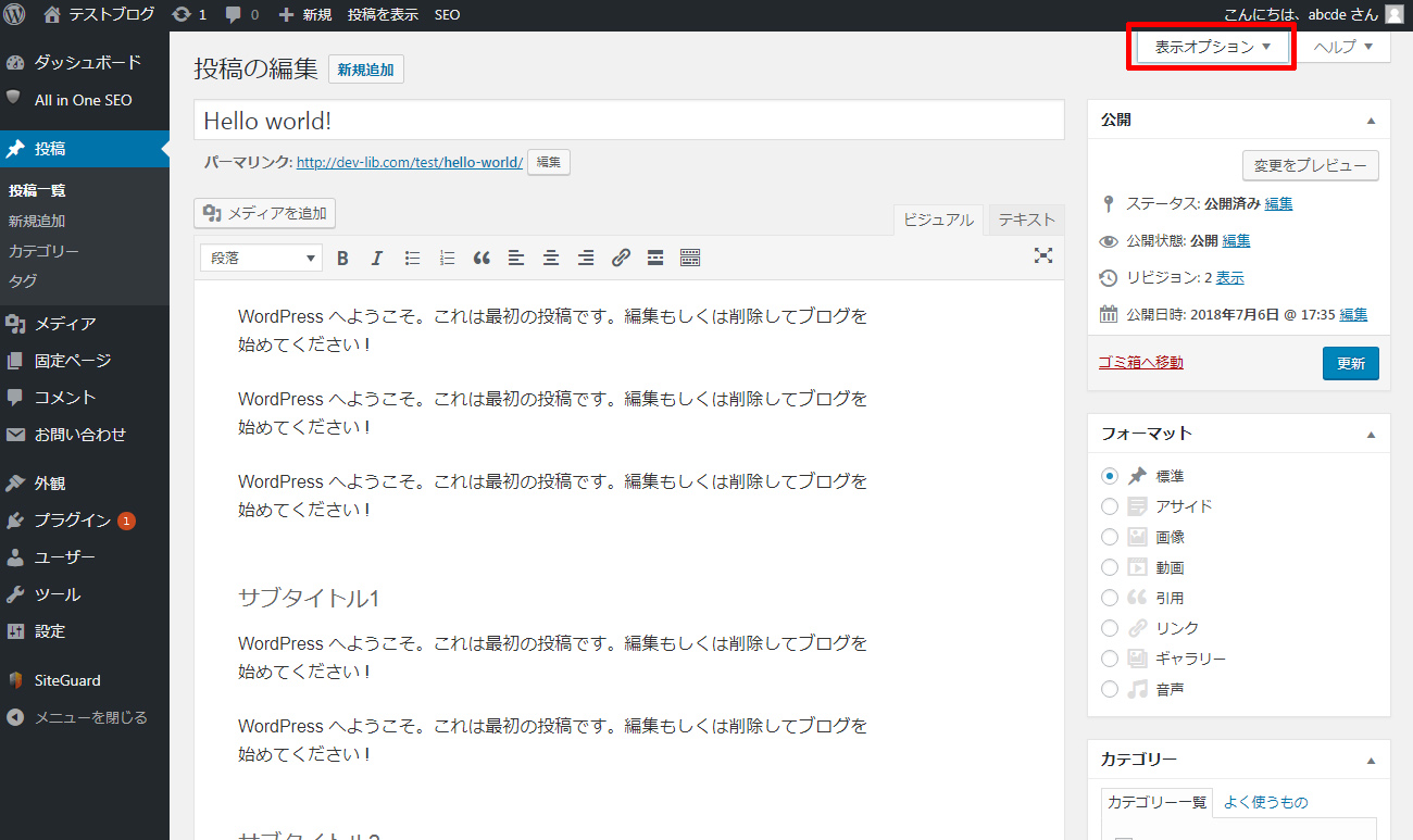 「投稿」もしくは「固定ページ」の編集画面を開き、右上の「表示オプション」をクリックします。