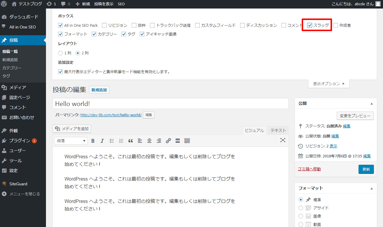 この編集はタイトル下のパーマリンクの部分でも出来るのですが、スラッグ用の入力フォームを投稿や固定ページの編集画面に表示することも出来ます。
