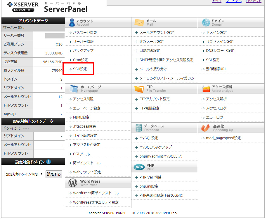 Xサーバーのサーバーパネルにログインし、「SSH設定」をクリック。