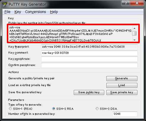 下の画像の赤枠を全てコピーして保存しておきます。僕は「pubkey.txt」でとりあえず保存しました。