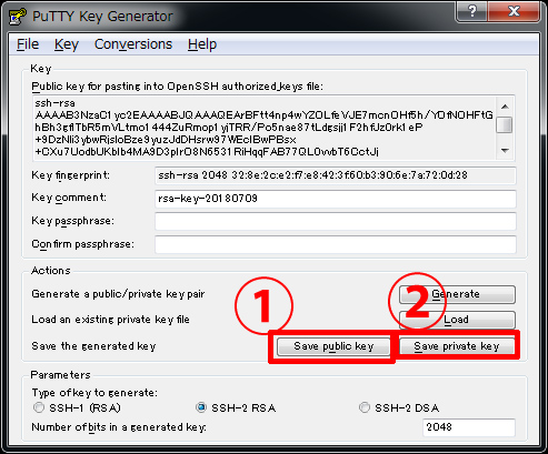 下の画像の①「Save public key」ボタンで公開鍵が保存できますが、うまくいかなかったので上の手順でコピーしましょう。