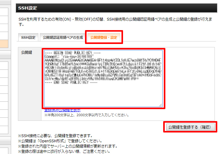 「公開鍵登録・設定」タブをクリックし、先ほど作成した公開鍵の「pubkey.txt」を開き、中身をまるごとコピーして貼り付けます。