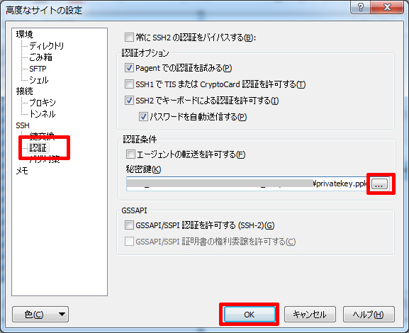 サイドメニューの「認証」をクリックし、先ほど作成した秘密鍵を選択します。