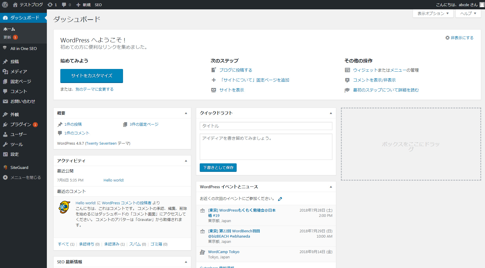 管理画面からサイトを表示したり、ブログや固定ページの新規追加へのリンクなどがあります。