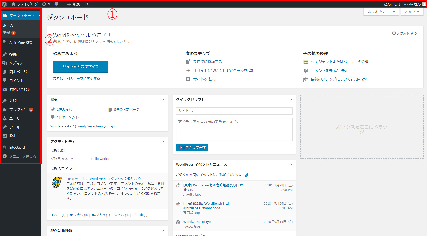ここでは、ブログの投稿やページの編集、プラグインの追加などを行うためのメニューが表示されます。