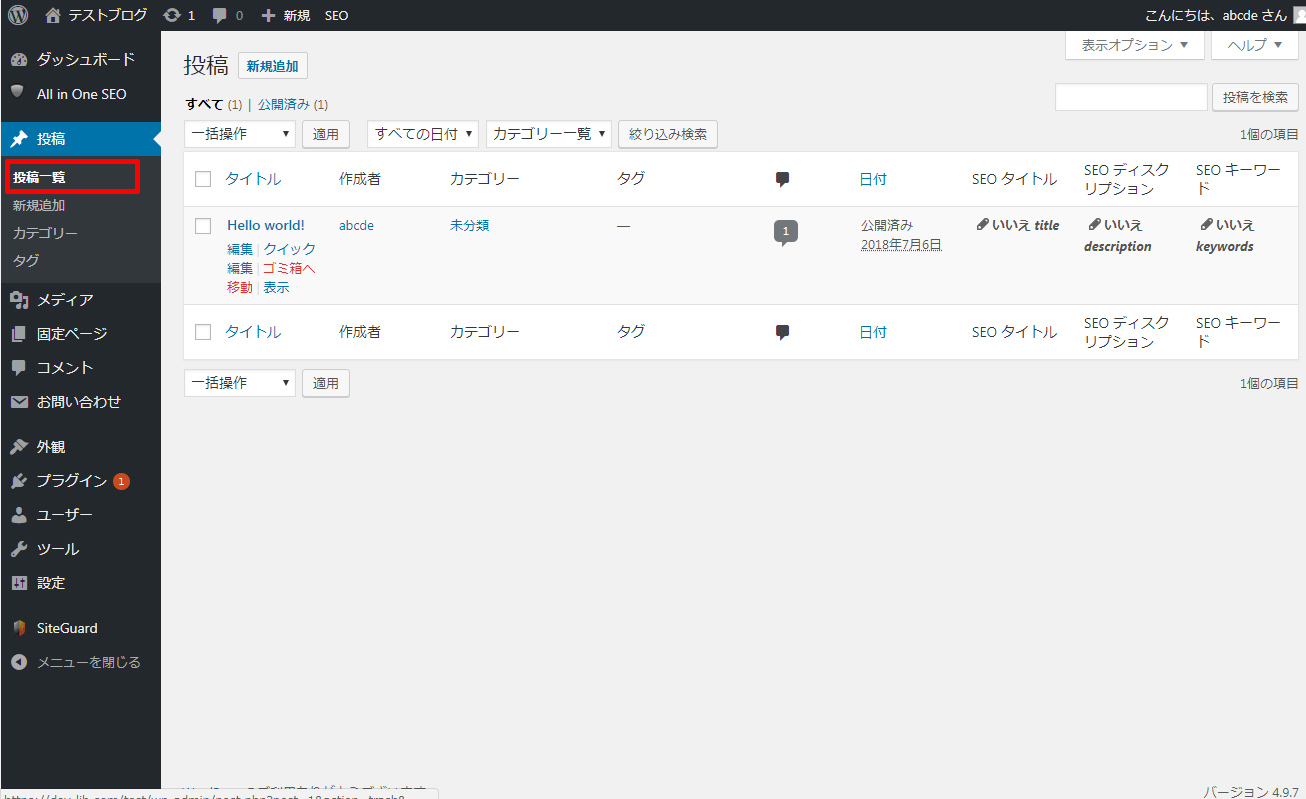 サイドメニューの「投稿一覧」でブログ記事の一覧を表示し、記事にマウスカーソルを合わせるとメニューが出てきます。