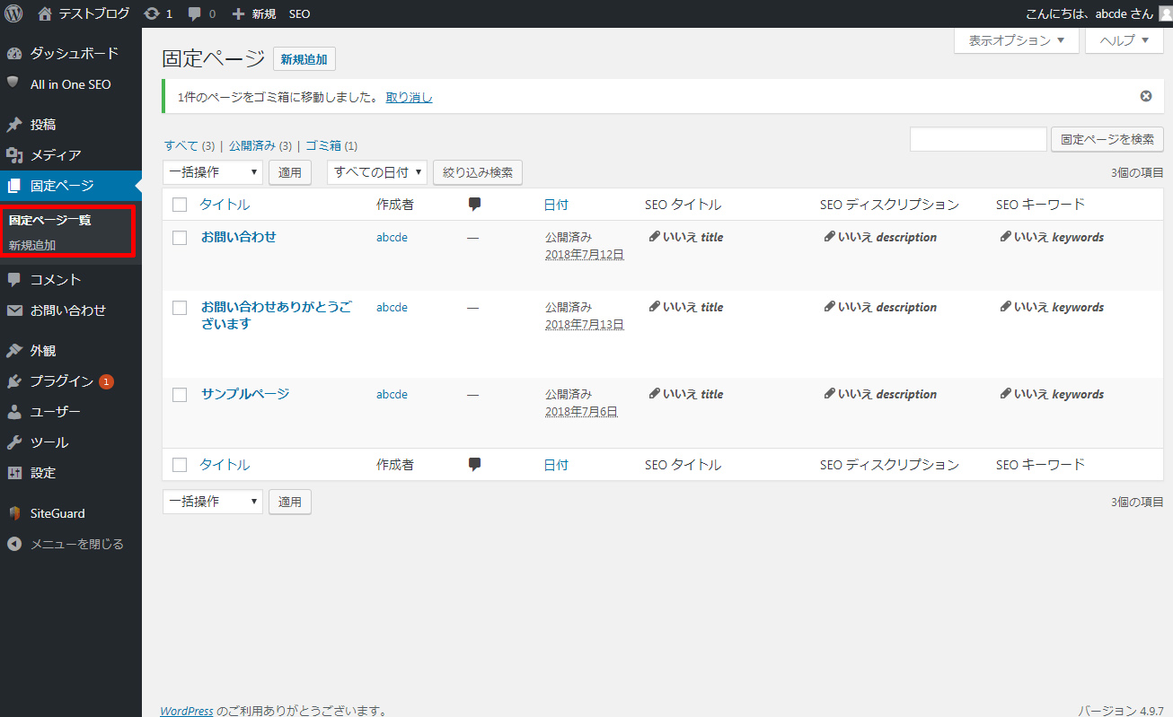 「固定ページ」も「投稿」と同様に「一覧」と「新規追加」があります。