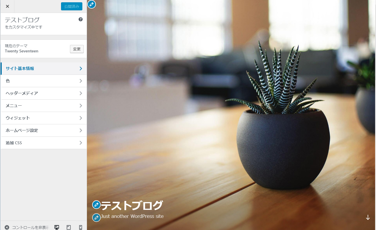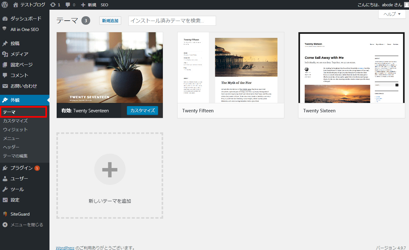 「テーマ」でサイト全体のデザインや機能など大枠を定義するテーマを変更することが出来ます。