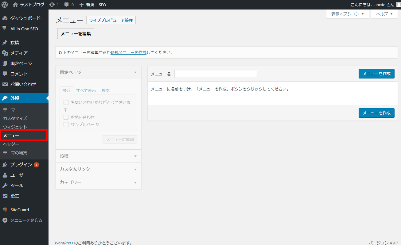 ここでメニューを作成すると、サイト上部(ヘッダー)やサイト下部(フッター)にメニューを追加することが出来ます。