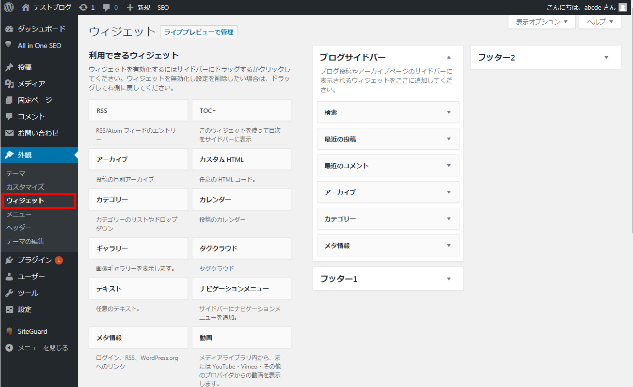 使い方は、左側の「利用できるウィジェット」を右側の追加したい場所にドラッグ&ドロップするだけです。
