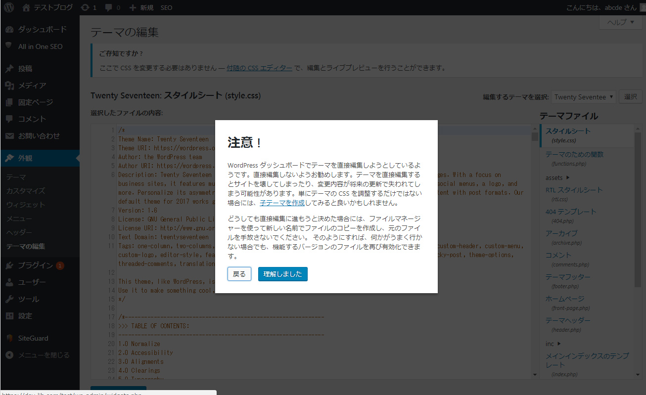 「テーマの編集」をクリックすると上記のような注意書きが出てきます。