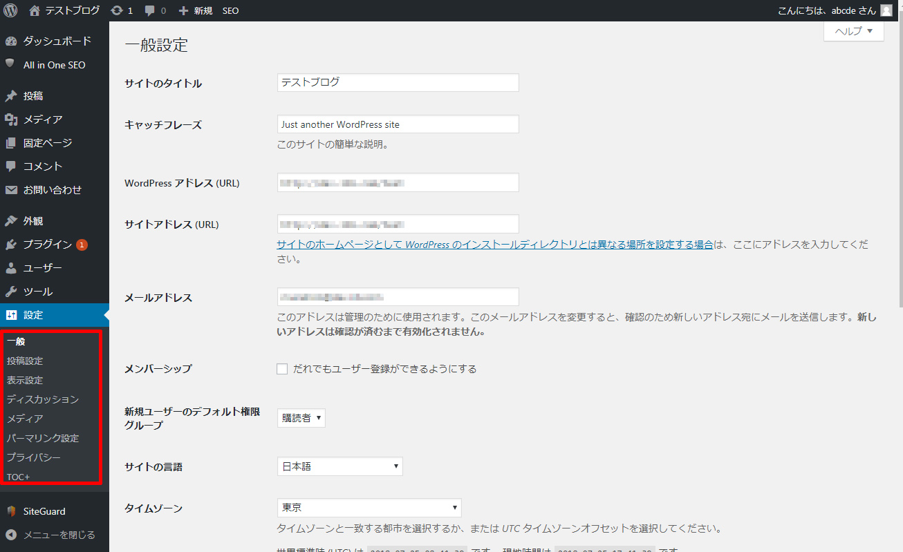 「設定」では、WordPressで作成したサイトのサイト名や、サイトの説明、URL設定などの基本設定が出来ます。